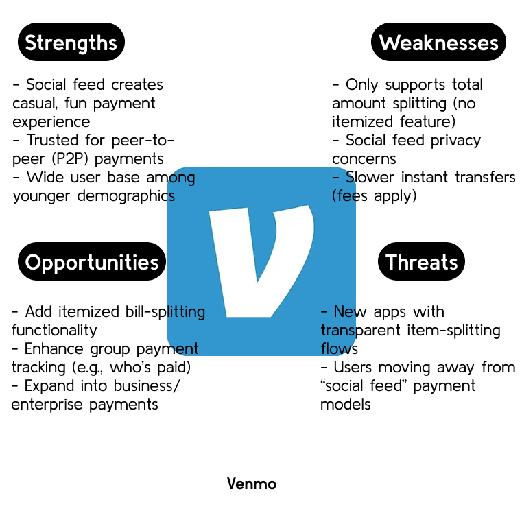 After conducting several user interviews, I analyzed the apps most participants currently use for splitting bills which include Cash App Venmo and Apple Pay. While these apps are popular for peer to peer payments, user feedback revealed critical gaps in their bill splitting experiences. These insights informed the following SWOT analysis.