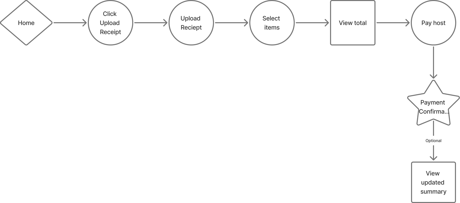 With a clear understanding of my users’ needs and frustrations, I focused on mapping out the ideal User Flow for Check Please. The goal was to ensure that both types of users, those who want to split fairly like Maya and those who prefer quick hassle-free payments like Jordan, could complete their tasks efficiently without friction.